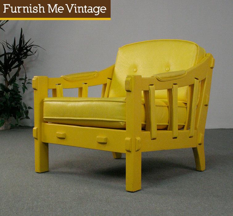 My heart jumped when I first spotted this fabulous canary yellow vinyl strapped chair. Produced by Ayers, vintage 1970s. This piece captures the bold spirit of Post-Modern design. Audacious design stands out against it’s purely Mid Century Modern, Danish influenced predecessors. Solid wood frame is painted yellow (original) with bright yellow vinyl seat cushions tufted on both sides. Particularly charming are the vinyl straps adorning the sides of the arm chair. Super comfy and very stylish. This funky arm chair is your “wow factor.”