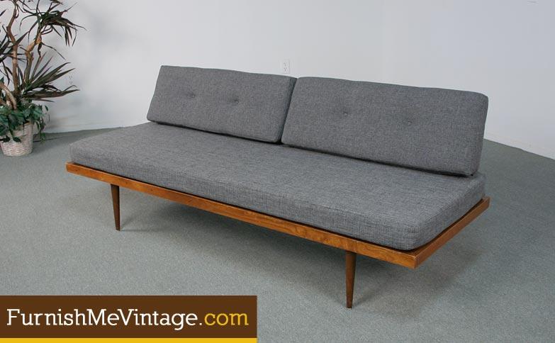 Danish style daybed sofa with hairpin back rest. Gray tweed upholstery is true to the Mid Century Modern period. You will be the first to enjoy this freshly recovered vintage couch! New high density foam cushion rests on top of a walnut wood platform. Upper bolsters have straps to attach the cushions to the back rest. Tapered pencil legs give a dainty look. Iron hairpin back support is strong and will last many more decades to come. Remove the bolster cushions to form a single size bed. Seat cushion (bed mattress) is 25″ wide x 71″ long without bolsters. Back bar easily lifts out of position to create an unobstructed sleeping area. Ideal for live/work spaces or seating/napping place in an office.