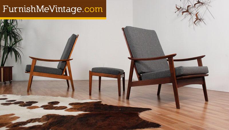Mid Century Modern high back lounge chair with ottoman. Newly upholstered in matching dark gray tweed style fabric. New foam. Iconic Danish style. One ottoman is included. Matching lighter high back chair pictured is sold separately.