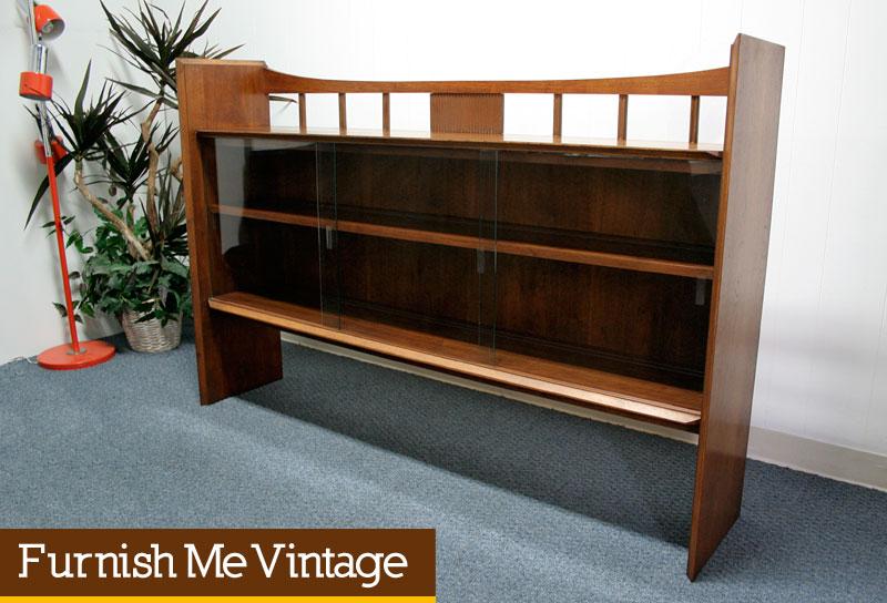 Handsome glass covered Mid Century Modern display case by Lane Furniture Company. This piece is ideal for use as a bar or china cabinet. Plenty of storage available with the two wide shelves. Three sliding panes of glass protect the inner contents from dust. All three of these glass panes slide both left and right.