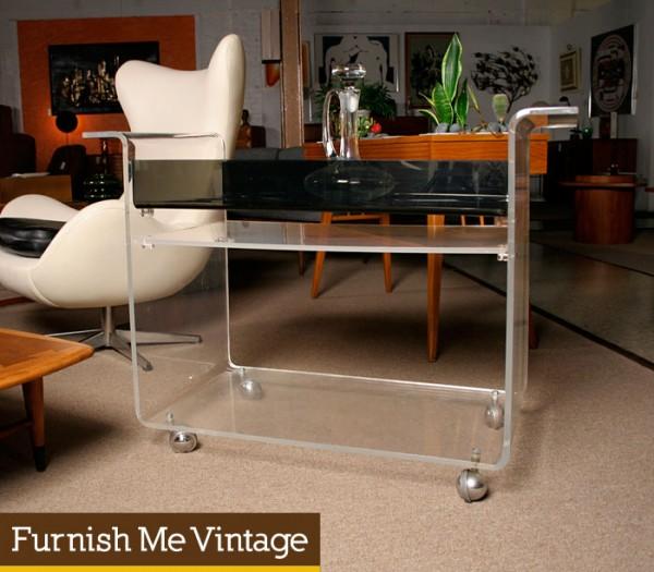 Vintage 1970s Lucite bar cart. Charcoal color smoked Lucite comprises the upper service area. Secure bottles or glassware in the cut-out holders. A second tier can accommodate utensils, napkins or a tray of hors d’oeuvres. Display bottles on the bottom most shelf. Thick, durable acrylic form is easy to maintain. Wipe away spills.