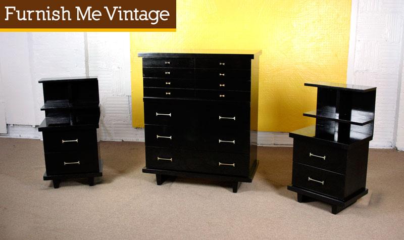 Vintage Mid Century Modern bedroom set by Johnson Carper. From the “Fashion Trend” line, this grouping consists of two nightstands and one high boy dresser. Plenty of storage with shelving and drawers in both nightstands. The tall dresser features five deep and wide drawers. Adorned with dog bone shaped metal drawer pulls. The post-market black paint gives this set a Hollywood Regency, or even Art Deco feel. The blocky feet and cantilevered planes hint towards Asian influence — drawing reference to works by James Mont.