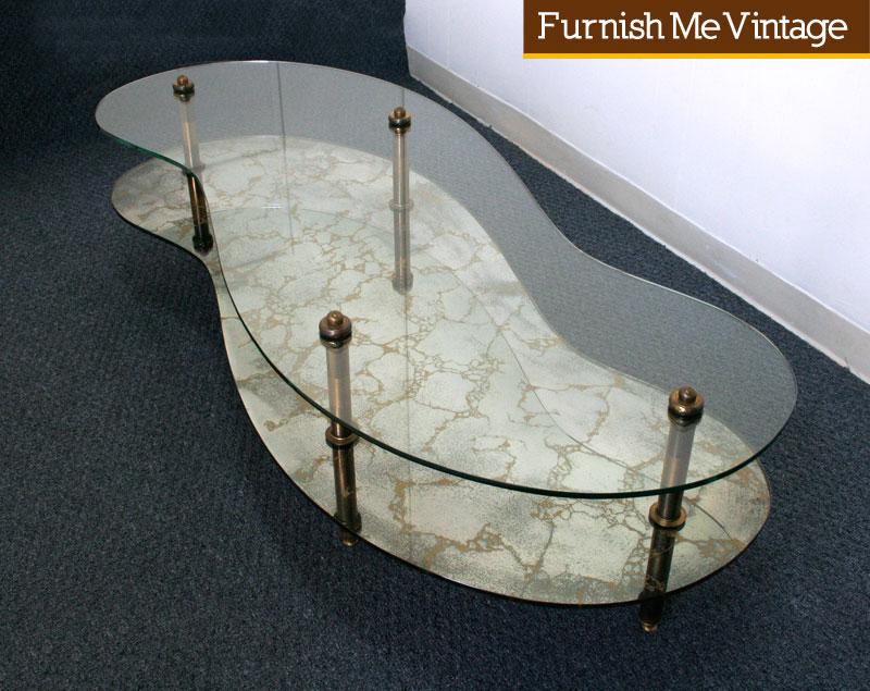 Vintage 1970s vintage Mid Century two-tiered amoeba / kidney style coffee table. The first tier is thick clear tempered glass. A marble patterned thick mirror makes up the bottom shelf.
