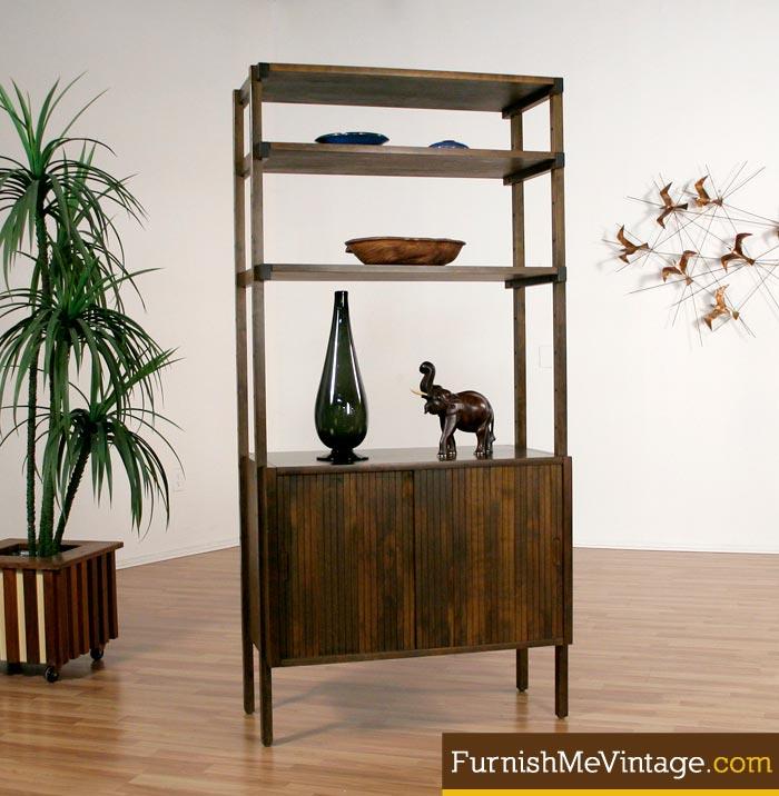 Mid Century Modern modular shelving unit with record storage. All shelves and cabinet are adjustable and/or removable. Sliding doors open to reveal a large cabinet. Single shelf inside is adjustable height.