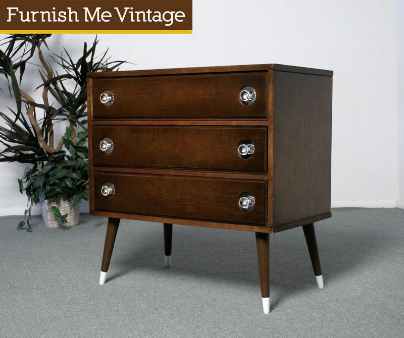 Mid Century Modern small walnut chest of drawers. This unit features unique Lucite (acrylic) and chrome original hardware pulls. This piece has a lot of character. Perfect for adding a “wow-factor” to your space. Great for use as supplemental storage in your bedroom, office or a child’s room, or place it in your bathroom to store linens. Legs unscrew for easy transport.