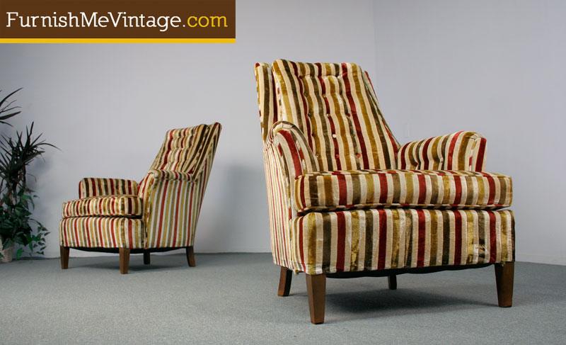 Super funky retro easy chairs. Only one chair left! Lots of period personality in this velvet upholstered chair. Bring your out your inner Austin Powers. Cozy and stylish. The plush velvet feels magical against the skin. Professionally steam cleaned — fresh for your home. All original and ready to go.