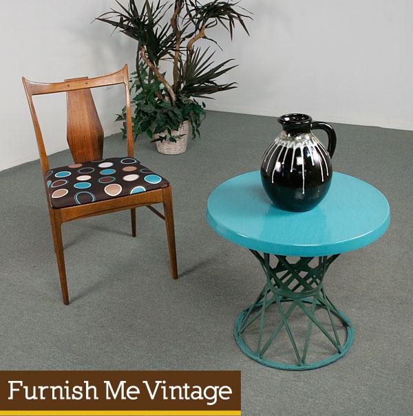 Mid Century fiberglass end table. Table top is made of fiberglass with textured surface. Base is comprised of spun fiberglass. An amazing material that holds up well against the elements. Half a century later, this thing still looks great! Turquoise color is vivid just as it was decades ago. Use this indoors or outdoors. This table looks great with the chair pictured (sold separately) and our azul lounge chair.