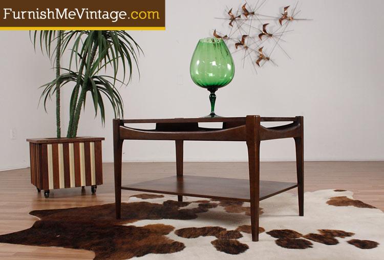 Exceptionally handsome American Mid Century Modern End Table. Danish styling with strong architectural feel. Fine details along the top perimeter. Note the gracefully bowed spanners below the table top. See how the top surface of the table is inset into the lower frame. This elements give an appearance that the top is floating within the lower chassis. Two tier configuration with a lower shelf for added storage.