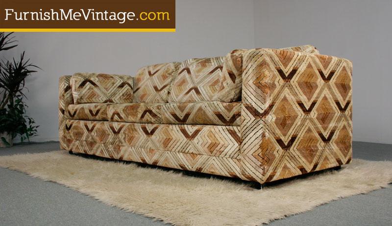You can almost hear the disco music playing as you set eyes upon this 1970s era sofa. Same sofa from JD’s apartment in the TV show “Scrubs.” Geometric pattern velvet sofa. Super plush and comfy! Tones of ivory and browns. Steam cleaned, fresh for your home!