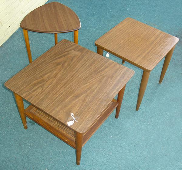 Small retro / vintage Mid Century Modern atomic era end tables / accent tables in very good condition. Included in this lot is a Two-tiered end table by Lane, stamped with the maker’s mark. The second tier has caning that is perfectly intact. The small square table has a maker’s mark and date stamp, but they’re illegible. The triangle table has no label.