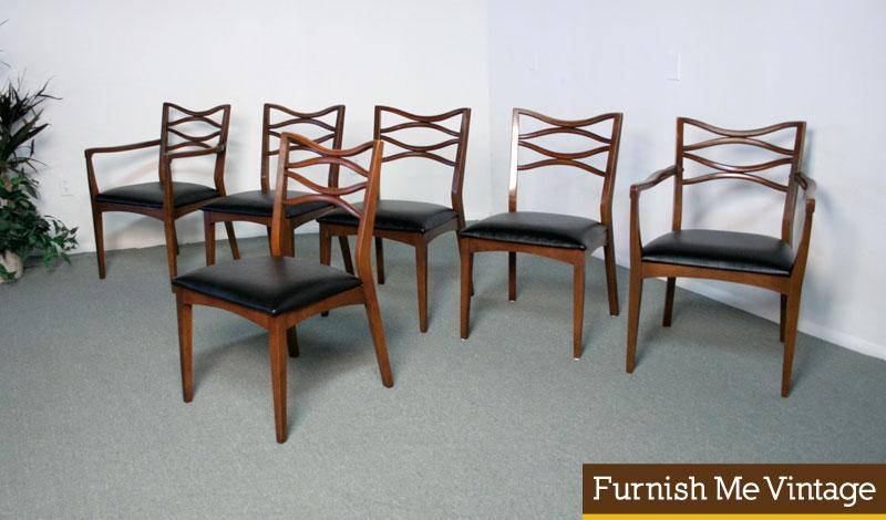 Six retro dining chairs, modern with a little bit of added flair. Sturdy walnut wood frames with ample seat room. The arm chairs have a wide span, in step with today’s standard for comfort. The seats have been professionally reupholstered in high quality black vinyl. This set consists of 2 captains arm chairs and 4 armless mates. Swerving bent wood design in the back rest delights the eye from all angles. A breeze to care for, simple wipe away any spills on the seats.