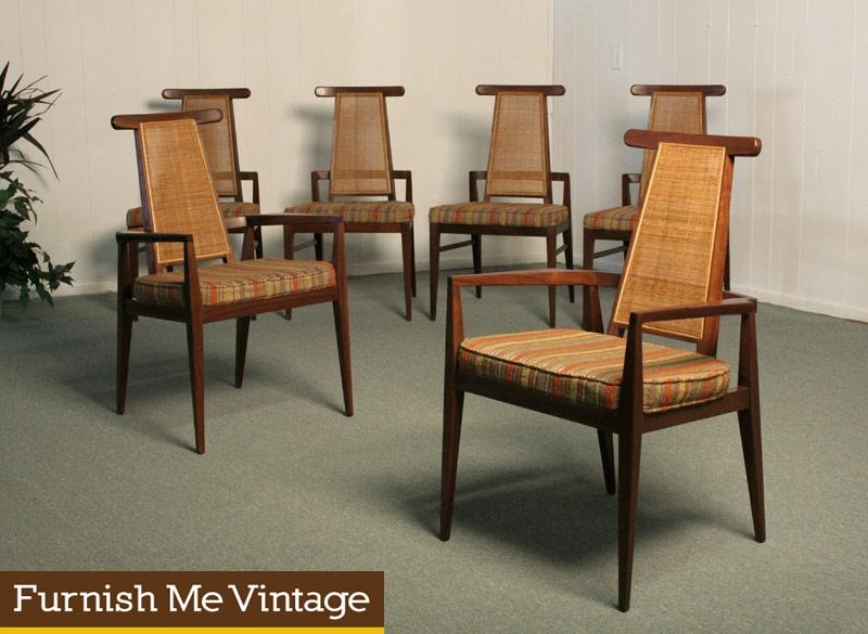 Stunning set of six Foster McDavid solid walnut frame dining chairs. This set consists of 2 captains arm chairs and 4 mate side chairs. Original retro upholstery is in fantastic condition. Don’t like the vintage upholstery? The seats unscrew for easy DIY recovering. Caning on the back is all intact. Scandinavian inspired Danish looking design. Super unique style far ahead of it’s time for the atomic age. These chairs are a feast for the eyes at all angles. In excellent vintage condition.