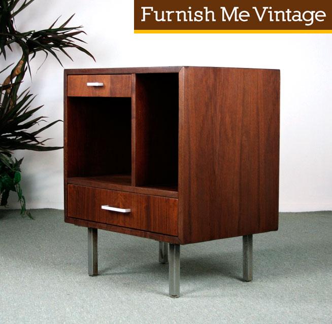 Handsome Mid Century Modern cabinet that translate well to a contemporary visual vocabulary. Handsome squared-off metal pulls and boxy form give this piece a decidedly masculine character. Versatile applications for use including a spare cabinet in the office, an end table with storage. We’re using it as a record cabinet in our store. We have a turn table sitting on top with records in the right-most slot. Drawers give you private storage. A lovely piece, resting on metal legs.