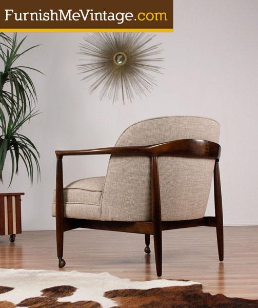 Mid century modern Ib Kofod Larsen for Selig barrel chair. Labeled below “Selig, made in Denmark.” Newly upholstered in period appropriate beige tweed fabric. Larsen signatures include the beautifully sculpted arms and sleek joinery. Rich solid walnut wood frame. Button tufting accents the back rest. Casters accent the two front feet. Rear feet are without casters (original configuration).