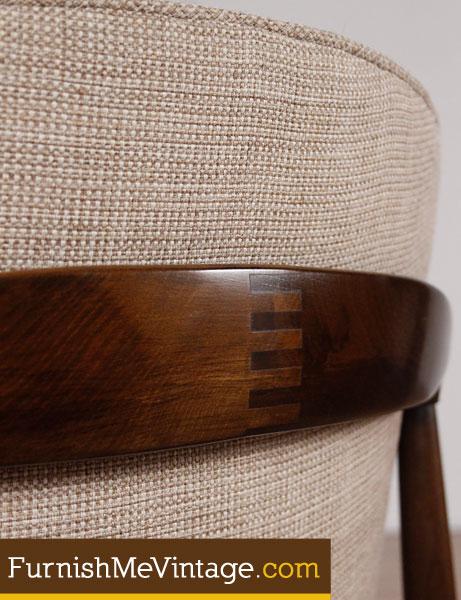 New upholstery. Chair sits firm with no sagging. Wood frame is clean save a few minor scratches.