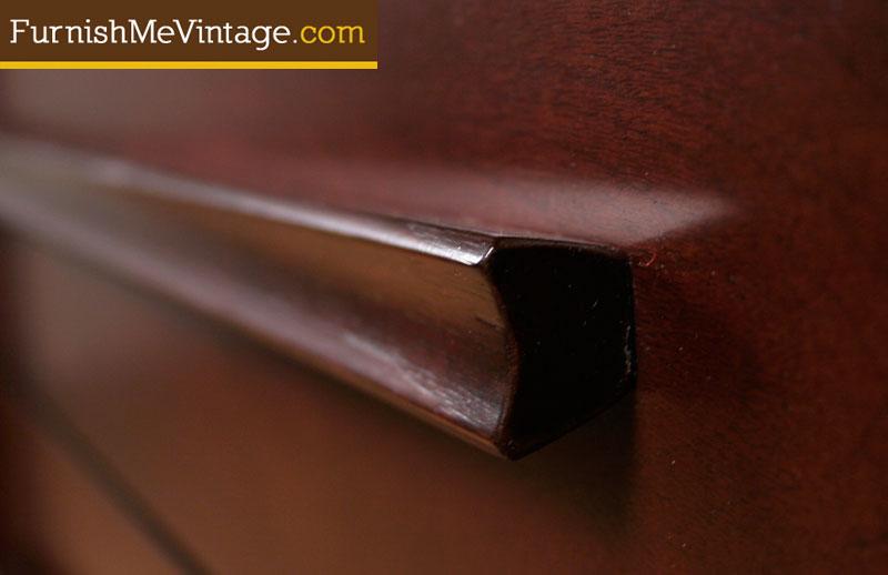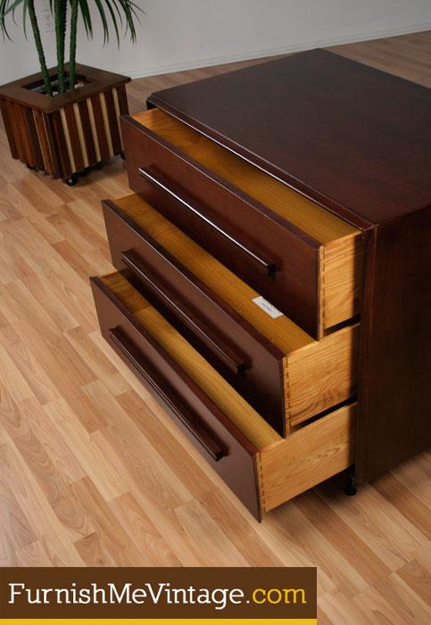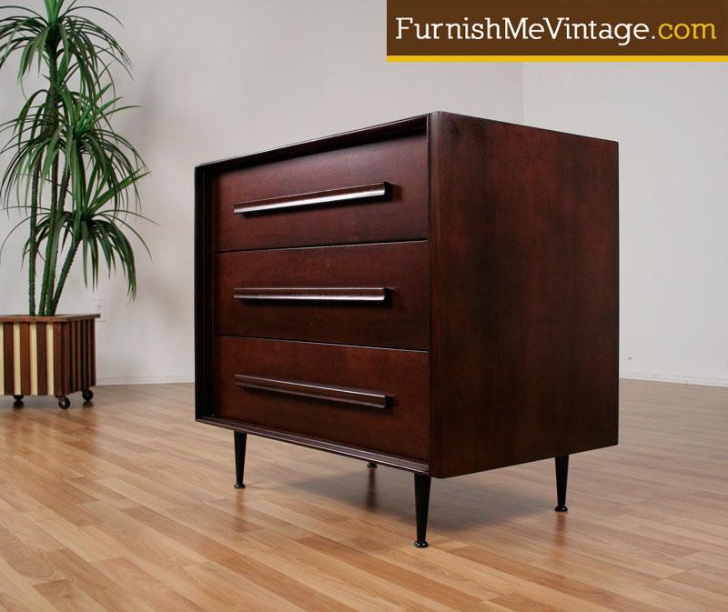 Mid Century Modern small dresser chest by TH Robsjohn-Gibbings for Widdicomb. Chest bears the maker’s label inside the second drawer. Previous owner had this piece professionally refinished. Dark mahogany colored wood. Metal feet are painted black. An heirloom quality piece by one of America’s most revered and collected designers of the period.