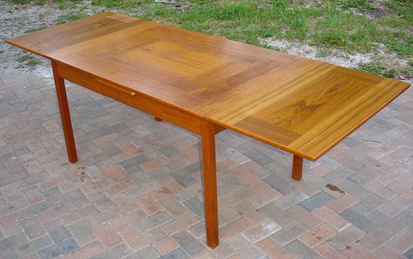 Large Danish teak table with two leaf extensions that fold underneath the top surface. Likely manufactured in the 1970s. The table top has a 12″ scratch, so the table is priced accordingly. Easily seats 10, stamped “made in Denmark.” The scratch may be fixed with sanding.