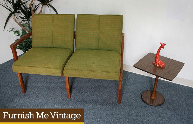 Danish style 1950s era original green upholstery couch settee. This versatile unit features sturdy American construction with oak wood frame. The original foam and upholstery have endured with amazing dexterity over the years. The cushions are soft and pliable. This is a one arm settee and can be arranged with an accompanying lounge chair to configure a sociable seating area in a home or office. We have a corresponding lounge chair to match (sold separately).