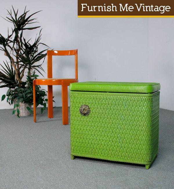 Adorable lime green retro clothes hamper. Circa 1960s, with metal brooch like embellishment on the front. Basket weave construction with quilted pattern on top. Get it while you can. This little cutie is sure to go quickly.