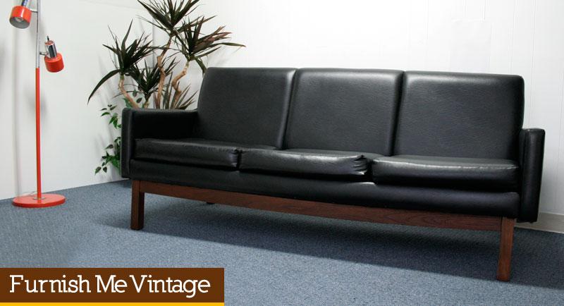 Mid Century Modern 1950s / 1960s Eames era black vinyl sofa with walnut frame. Sleek, streamlined Danish styling. Comfortable, even by today’s standards.