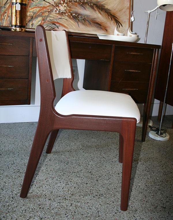Walnut frame Mid Century Modern Danish chair with new professionally upholstered, high-quality, white vinyl upholstery on the seat and back rest. In excellent, 9 out of 10 vintage condition. Wonderful accent or desk, office chair. The dark walnut chair has a rosewood type reddish patina.