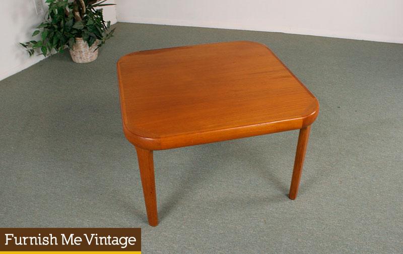 Large square retro Danish Modern teak end table. Lovely inlay opposing wood grain detail on the top surface. Exhibits the clean line aesthetic of Scandinavian design. Use this as a large side table or coffee table.Rounded edges and thick sturdy legs make this table ideal for homes with children or pets.