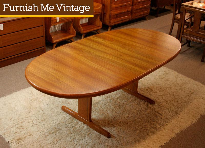 Oval shaped Danish Mid Century Modern dining table. Stamped below “AM 69, Made in Denmark.” Sturdy construction with trestle leg below. This design allows for maximum space underneath the tables comfortably accommodating legs and chairs. The single solid teak trestle support speaks to the Scandinavian minimalist aesthetic, lessening the visual noise created by numerous table legs and spanners. Easy to use butterfly leaf folds and stows below the table top. Table is pictured with butterfly leaf inserted (max length). We have this table staged with a set of 6 dining chairs in our store. Pair this table with any of our several sets of retro dining chairs (sold separately). We also have credenzas to complete your dining room.