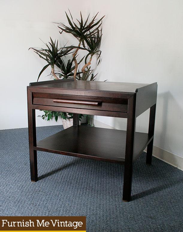 Deep reddish brown patina oversized end table by Dunbar furniture company. This piece has the quintessential clean lines from the American Mid Century Modern period. Accented with a tiny hint of Asian inspiration exhibited in the raised ridges along the top surface perimeter. A versatile piece, use it as a nightstand in the bedroom or end table in the living room. There is a wide drawer at the top of the side table. This piece may or may not be from a Dunbar collection by famed designer Edward Wormley. The Dunbar logo resides in the drawer interior.