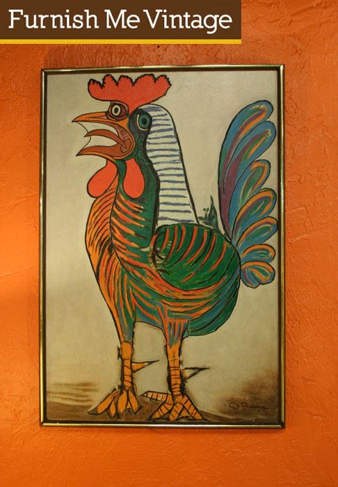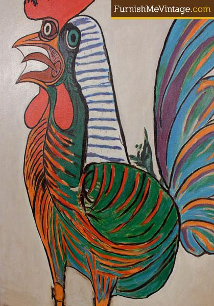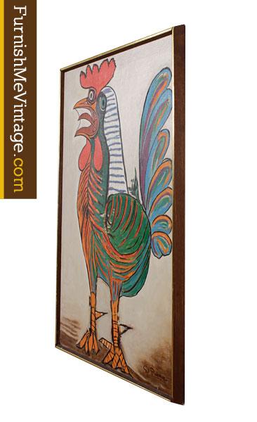 Vintage 1978 Modern art painting by Ed Blakeman. Subject is a stylized chicken. Rendition is similar is style to Picasso. Cubist technique brings to mind paintings such as “Guernica” and “Girl Before a Mirror.” This is an original, signed, painting on canvas. Frame is intact and ready to hang.