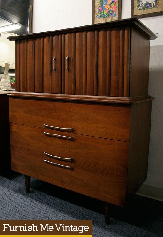 Handsome Mid Century Modern retro gentleman’s dresser chest of drawers. The upper half features an atomic skewed bow-tie shaped top surface. The top portion features a cabinet with a slide-out drawer covered by fluted, rippling solid wood doors. Three deep, wide, spacious drawers make up the bottom portion. All original, freshly polished hardware. The top has been recently refinished. We have a matching triple dresser, mirror and two nightstands (sold separately). Search “fluted” on our site to find accompanying pieces.
