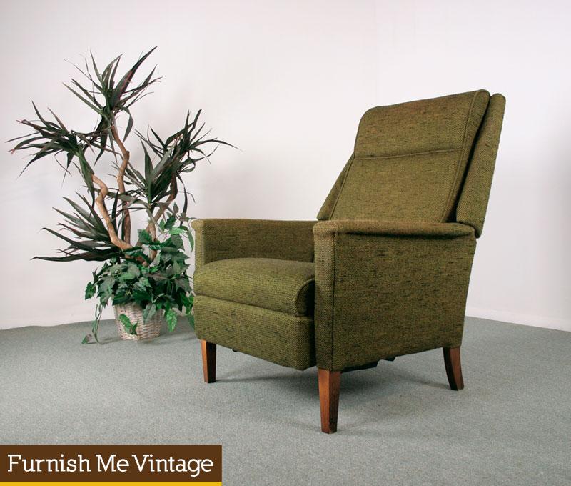 Olive green retro, early 1970s era, La-Z-Boy recliner. The chair that defined comfort for generations of Americans. This reclining easy chair is all original and in fantastic condition. The original olive green tweed upholstery has no stains, and has been steam cleaned, fresh for your home. The tilting mechanism glides back with ease. Use it upright, or lean it back into a near bed-like position. No sacrificing comfort as with some Danish styles. Mid Century Modern look with contemporary amenities.
