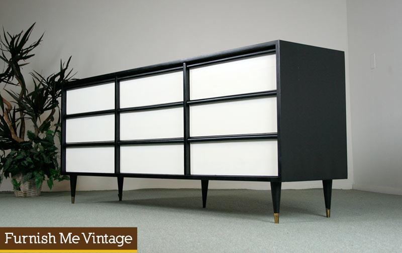 Mid Century Modern long dresser. Whopping 9 drawers of storage! Each one spacious, and easy gliding. Solid wood construction — no particle board. This piece came to us with chipping paint. We stripped it and repainted — fresh for your enjoyment. Top is white laminate (Formica). Wipes clean, very durable. A great way to break up the all brown wood monotony that can occur with retro design schemes. Use it in the bedroom as intended or re-purpose as an entertainment center credenza.