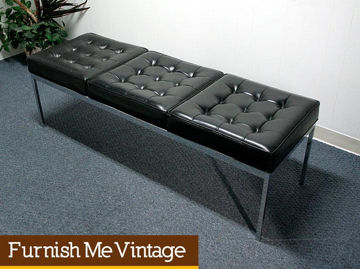 Retro Mid Century Modern vintage three seater bench designed in the manner of Florence Knoll. Original black Naugahyde upholstery with beautiful woven square tufting. All new jute webbing and cambric below the seat cushions.