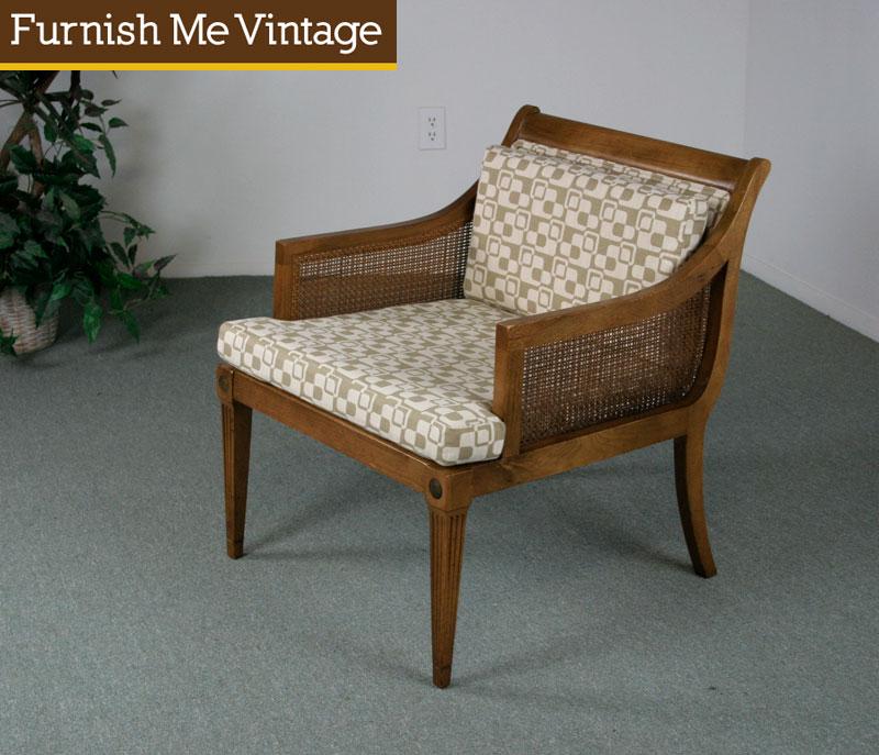 Excellent vintage condition. New upholstery. Caning all intact. Wood frame clean with only a few minor scuffs.