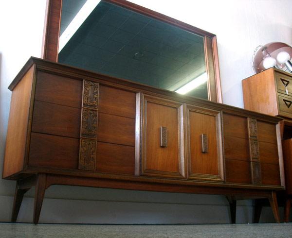 This pairing of a retro Mid Century Modern, circa 1960s Bassett Mayan line dresser/credenza with a large vintage Mid Century Modern Kent Coffey rosewood mirror is absolutely stunning. You must see it in person to appreciate the detail in the Mayan themed carvings on the wooden handles of the credenza. The credenza / buffet / dresser also features two stone tile accents on the top surface. In very good condition. The rosewood mirror is huge and in excellent condition. Use this unit would be a show-stopper in any room. Use it in a dining room as a credenza or buffet, sideboard. It can be an entertainment console in the living room or dresser in the bedroom.
