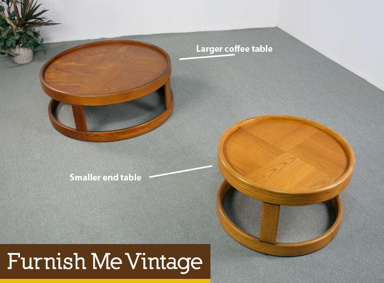 Retro 1970s era monumental circular coffee table and end table. Brutalist feel to the obtuse forms. Coffee table is larger and has a darker patina than the smaller, lighter end table. Both tables appear to be made of oak wood.