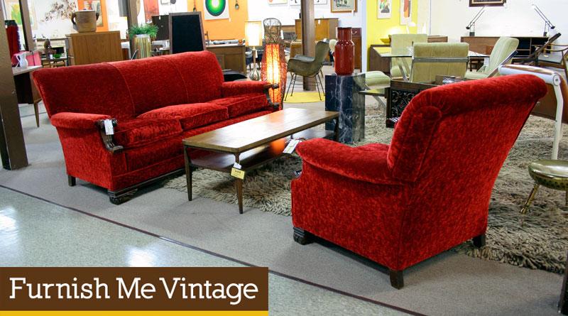 Matching sofa and arm chair living room set. Recently reupholstered in red velvet fabric. Well built with Marshall Unit seat cushions. Vintage 1940s with solid walnut sculpted accents on the arm rests and feet. Super clean, no remarkable wear. No pet fur or odors. Sultry red fabric is a real eye-catcher. Sure to make your space pop. Large size and ample cushioning meet today’s standards for comfort. No problem lying down to watch a movie on this couch or curling up with a book in the arm chair.