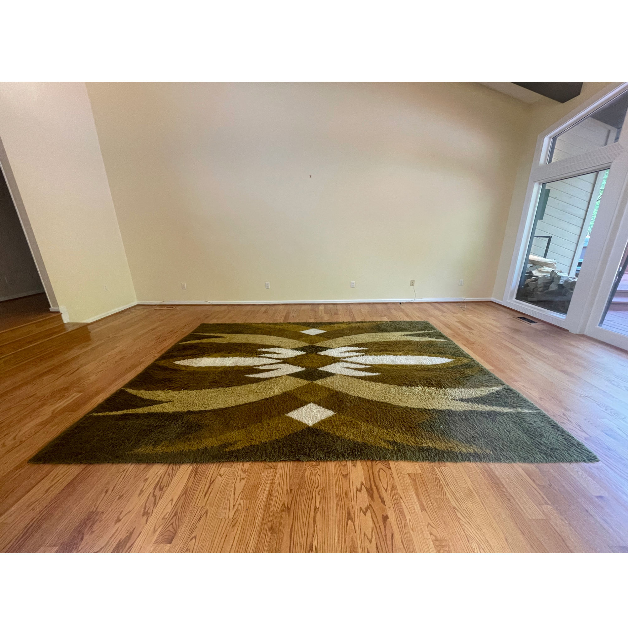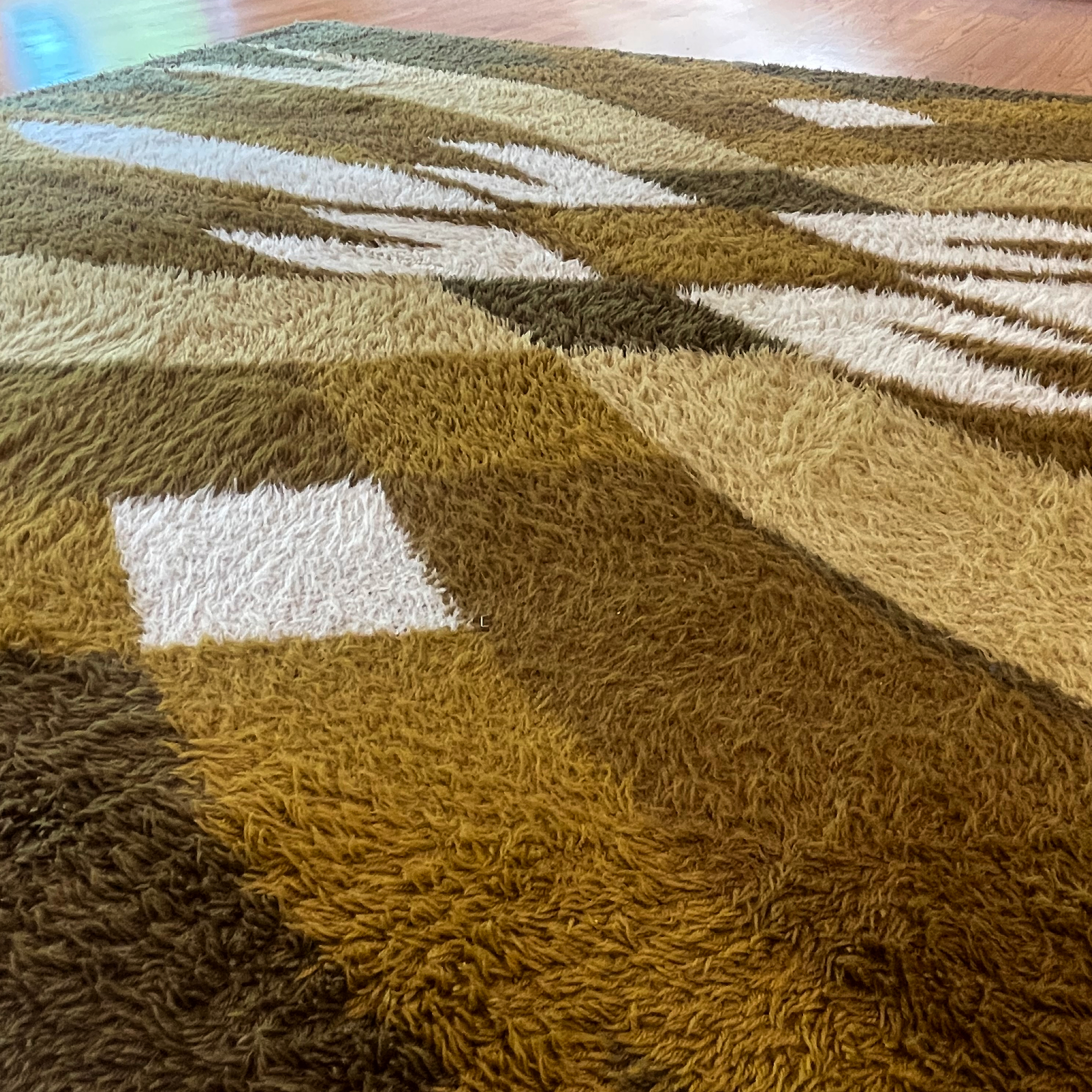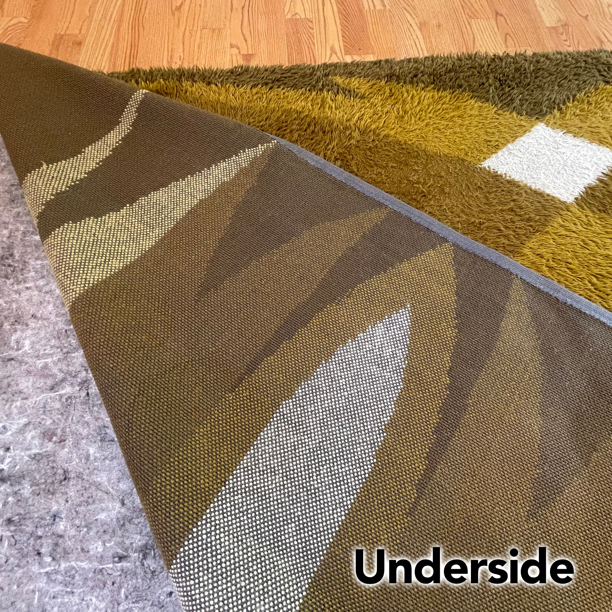Scandinavian wool Rya rug, measuring 11 feet x 8 feet. The large shag area rug features a symmetrical geometric pattern in earthy tones of green, brown, beige, and white. This combination of natural colors and dynamic pattern create visual interest without being visually distracting. Look at the backing to see the quality of the weave in this high-pile Mid-Century era rug. The collector’s grade Rya is likely Swedish or Danish origin, dating from the 1960s–70s. Only a small tag on back exists, with a type of serial or model number. The design reflects Scandinavian Modernism and an appreciation for natural materials. This rug is the perfect statement piece to anchor your room. The 11 feet x 8 area rug is large enough to compliment your sofa, chairs, and occasional tables. If you love Ryas as much as we do, ask us about our wall hanging rug, our large cream and beige ombre rya, and our stunning orange narrow ryas (sold separately).