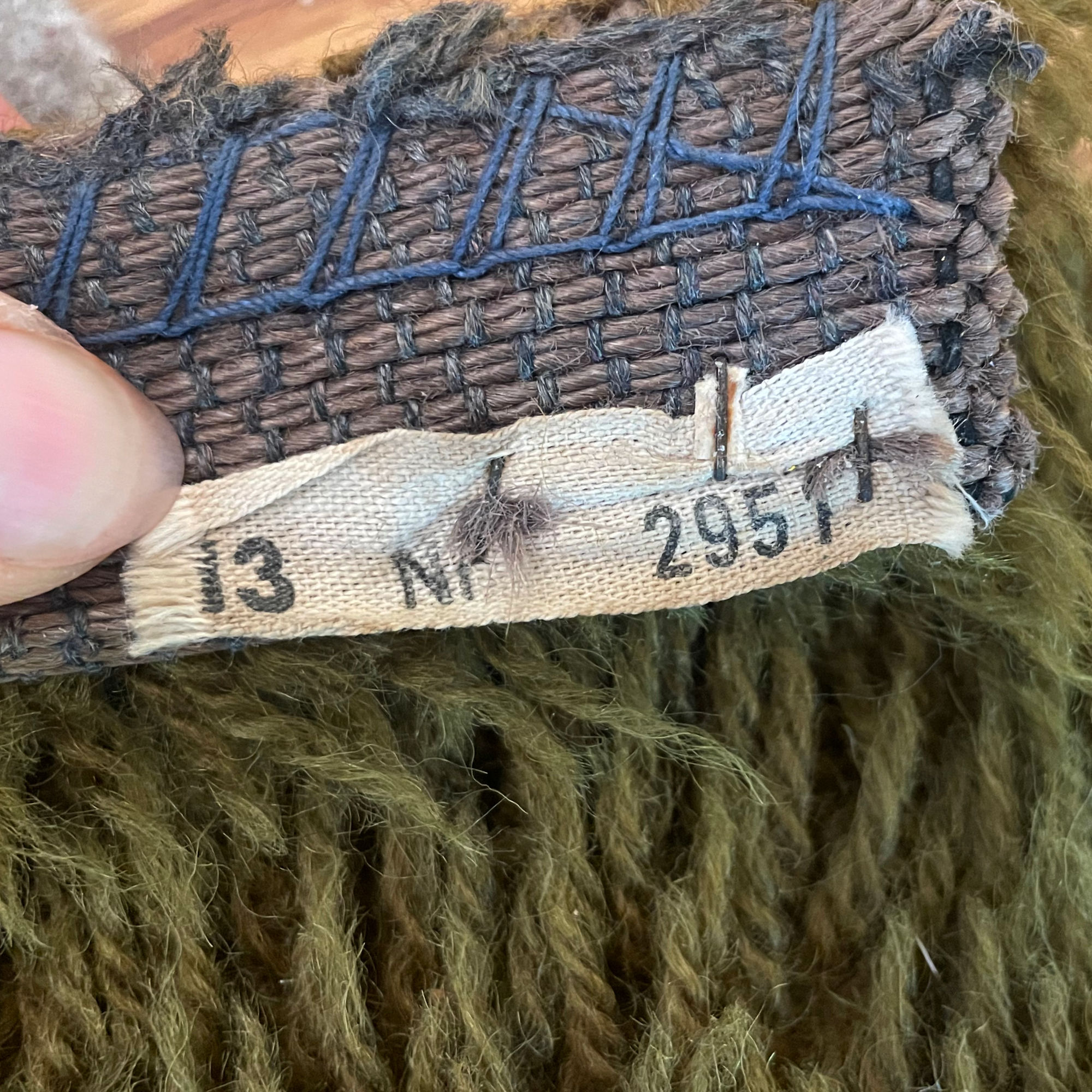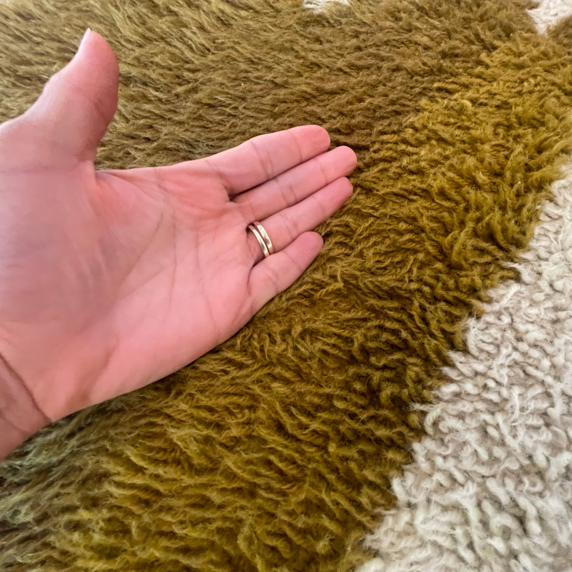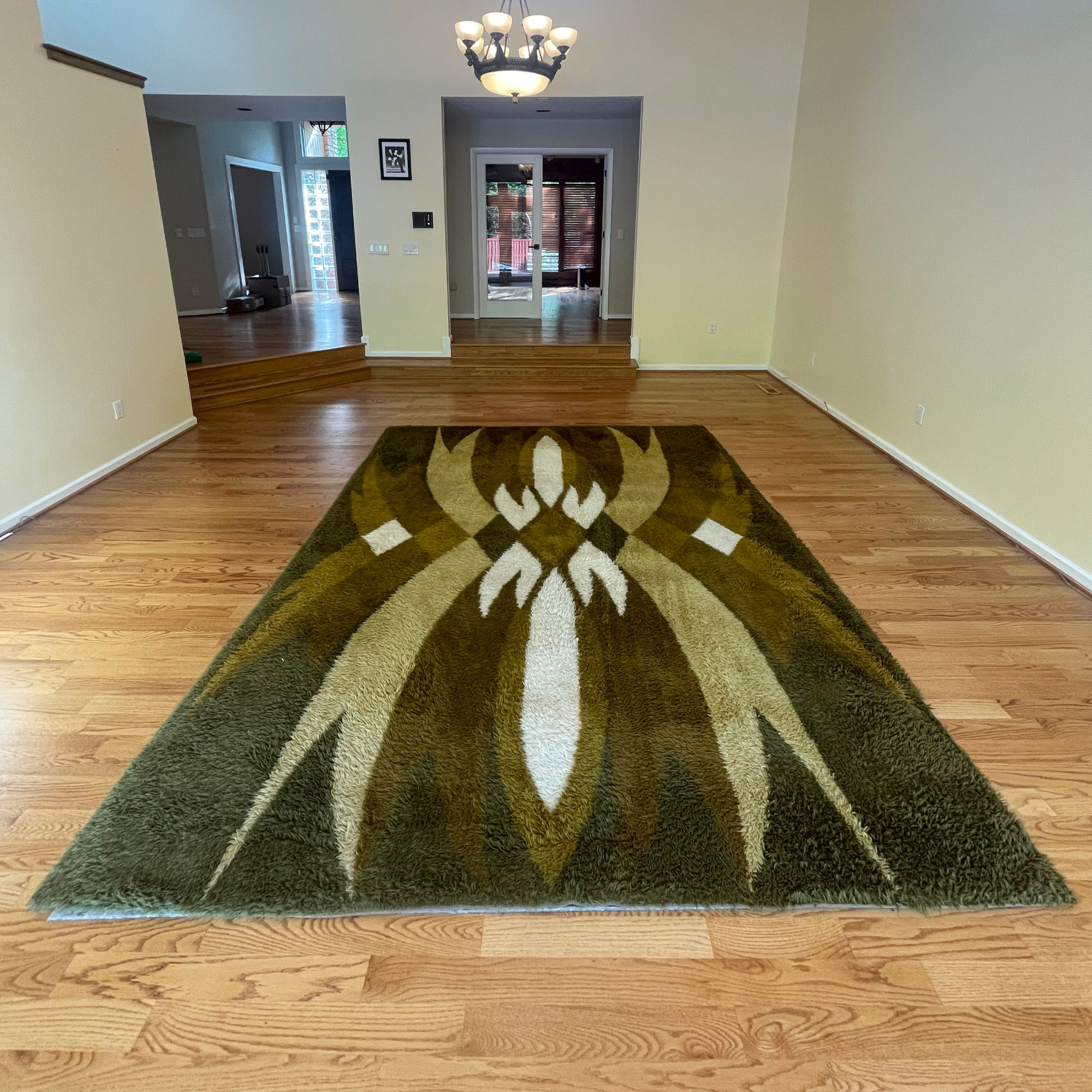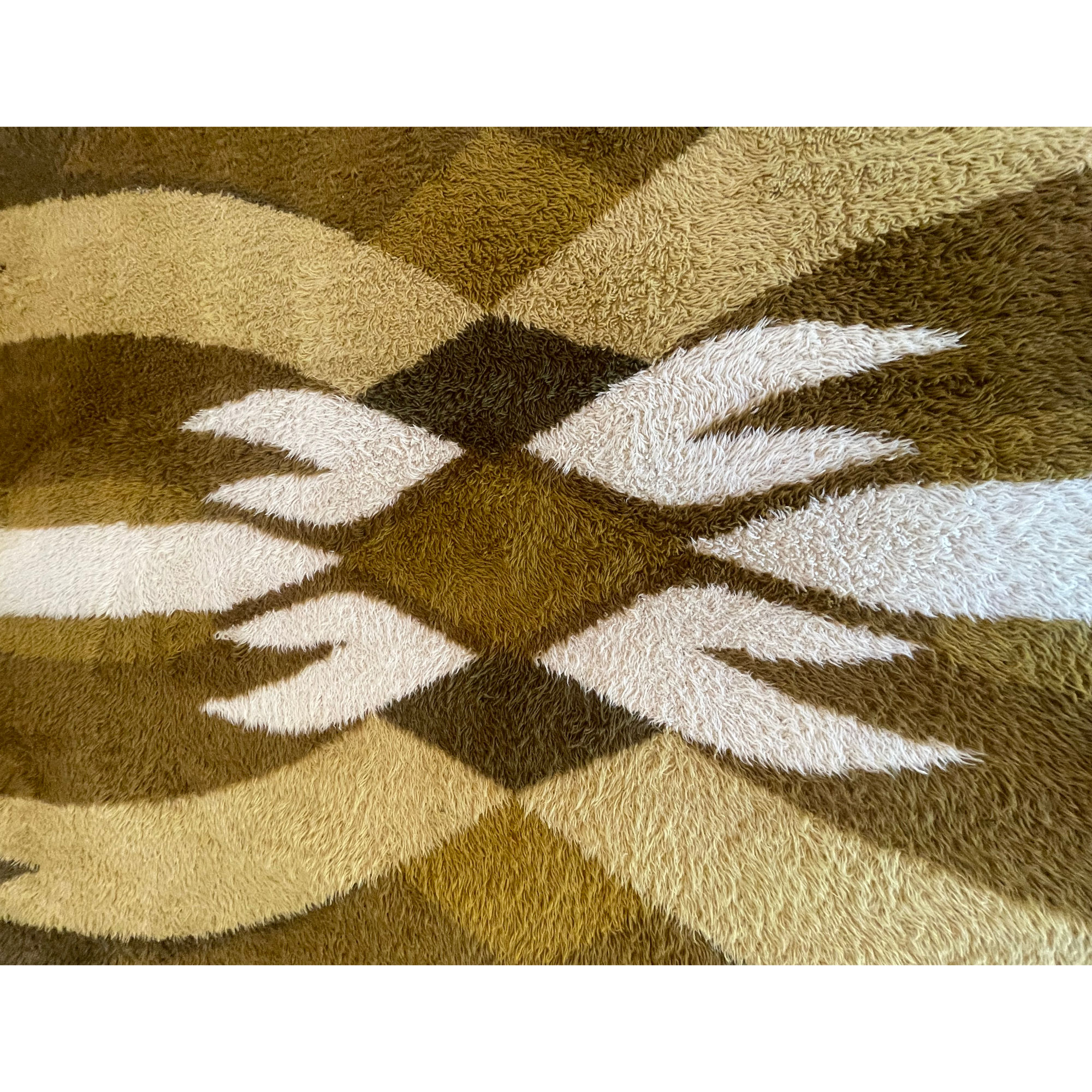 Scandinavian wool Rya rug, measuring 11 feet x 8 feet. The large shag area rug features a symmetrical geometric pattern in earthy tones of green, brown, beige, and white. This combination of natural colors and dynamic pattern create visual interest without being visually distracting. Look at the backing to see the quality of the weave in this high-pile Mid-Century era rug. The collector’s grade Rya is likely Swedish or Danish origin, dating from the 1960s–70s. Only a small tag on back exists, with a type of serial or model number. The design reflects Scandinavian Modernism and an appreciation for natural materials. This rug is the perfect statement piece to anchor your room. The 11 feet x 8 area rug is large enough to compliment your sofa, chairs, and occasional tables. If you love Ryas as much as we do, ask us about our wall hanging rug, our large cream and beige ombre rya, and our stunning orange narrow ryas (sold separately).