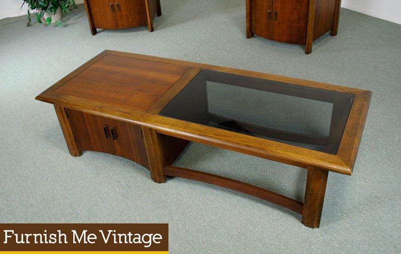 Post-Modern retro walnut wood coffee table similar to works by Dunbar. Vintage 1970s with partial smoked glass top and walnut wood top. Conveniently rest beverages on the glass portion without worrying about water rings. Practical, covered storage cabinet space below. Ideal for storing DVDs, magazines and other media. Even use this as a console entertainment Center with your flat screen situated above. Electronic components can be neatly stowed below, out of sight, but easily accessible. Form is a nice balance between modern and traditional. Style is informed by Asian influenced designs by James Mont. We have two matching end tables, (sold separately.)
