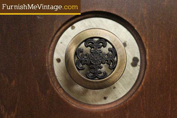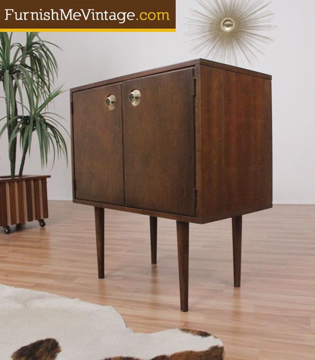 Mid Century Modern walnut cabinet. Gold pulls adorn both doors. Wide open cabinet space inside. Ideal for supplemental storage in a family room or office. Perfect for storing records.