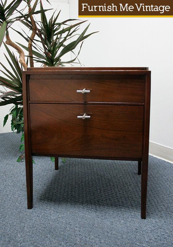 Vintage American made Mid Century Modern Widdicomb end table / nightstand with draw bridge door bottom cabinet. The top of this piece features a spacious drawer and bottom cabinet with a drop down door gate. The table is finished on all four sides. Use it between two chairs, at the side of your bed or sofa. Excellent extra bit of storage to hider clutter in a living space. Hardware shown in photo is not original, but we have the original pulls if desired.