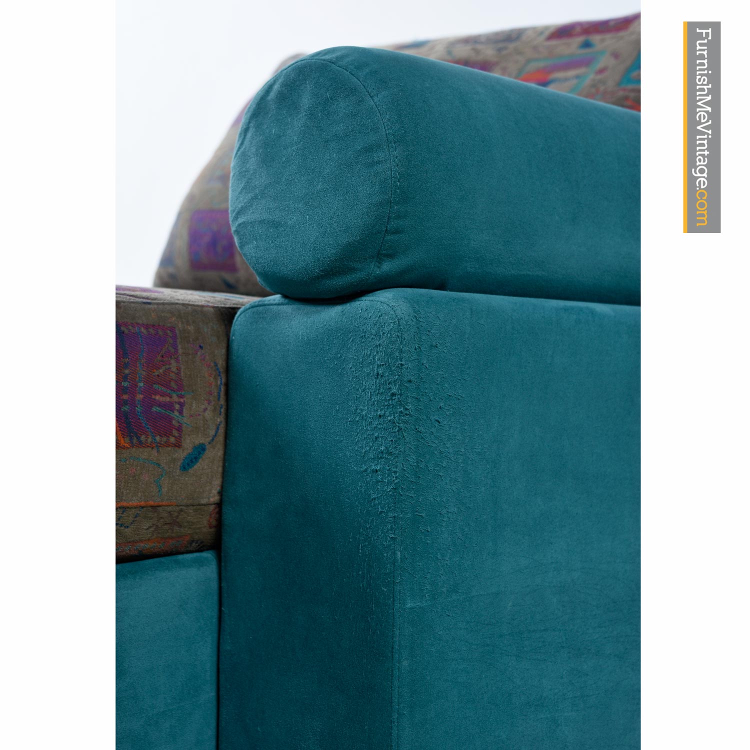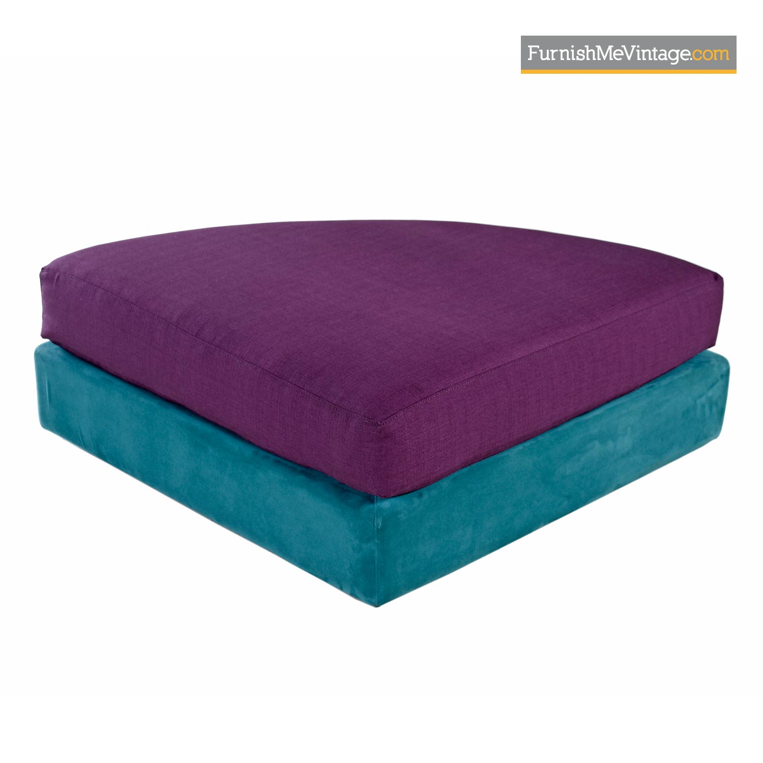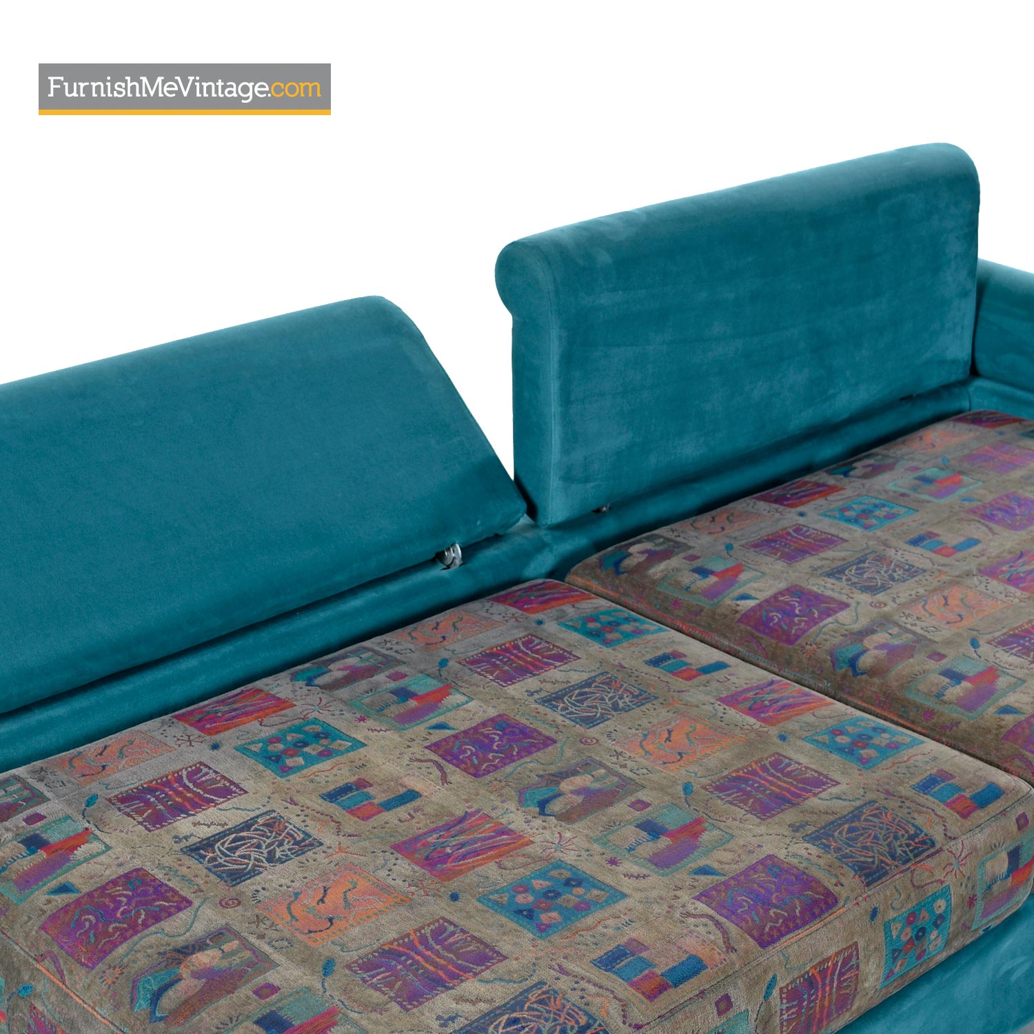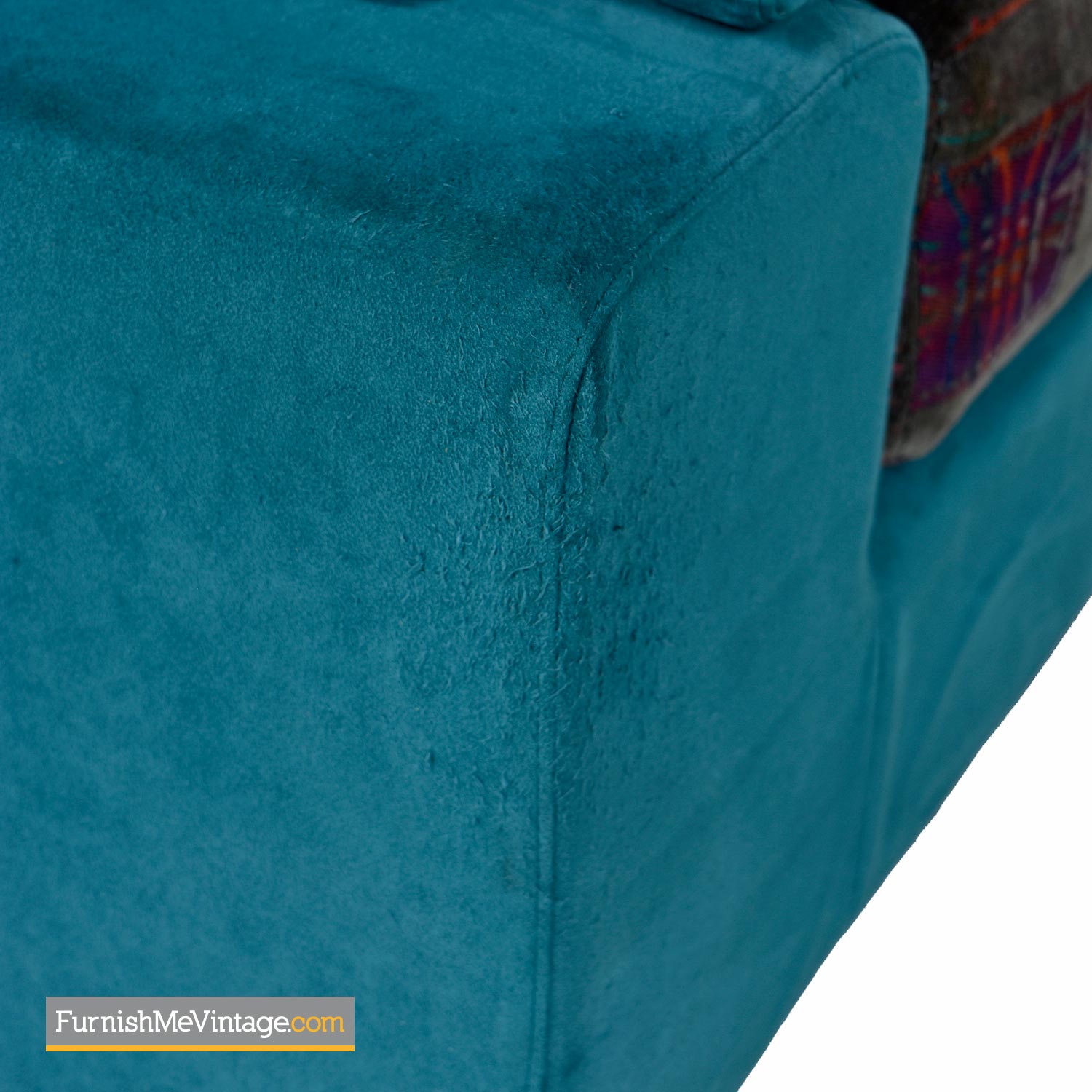 Outstanding quality is the distinction with this charming modern DellaRobbia sectional sofa seating group. A true luxury brand. The sectional consists of four modules; (2) lounge chairs, (1) corner piece, and (1) love seat with right facing arm. Each piece can be used independently or joined to create various configurations of a sectional. Both of the love seat sections feature adjustable back/head rests allowing one to position the back support in a standard upright position, or two different reclined angles. The sofa boasts it’s original teal microsuede upholstery on the body with the original funky pattern on the cushions. The corner piece has been recovered in a contemporary violet fabric to compliment the original design. This sectional is of utmost craftsmanship with the goose down filling and top notch construction that made DellaRobbia famous.