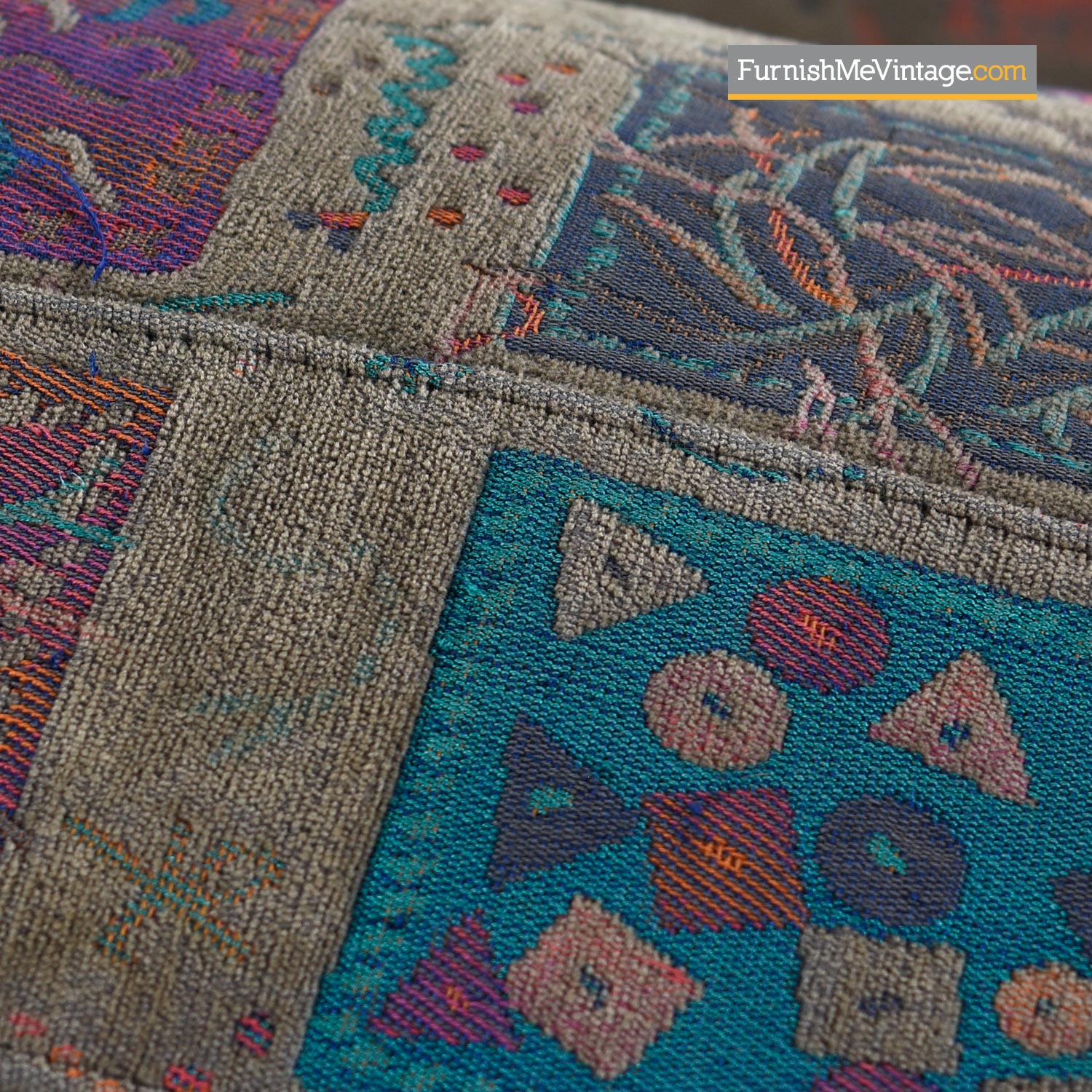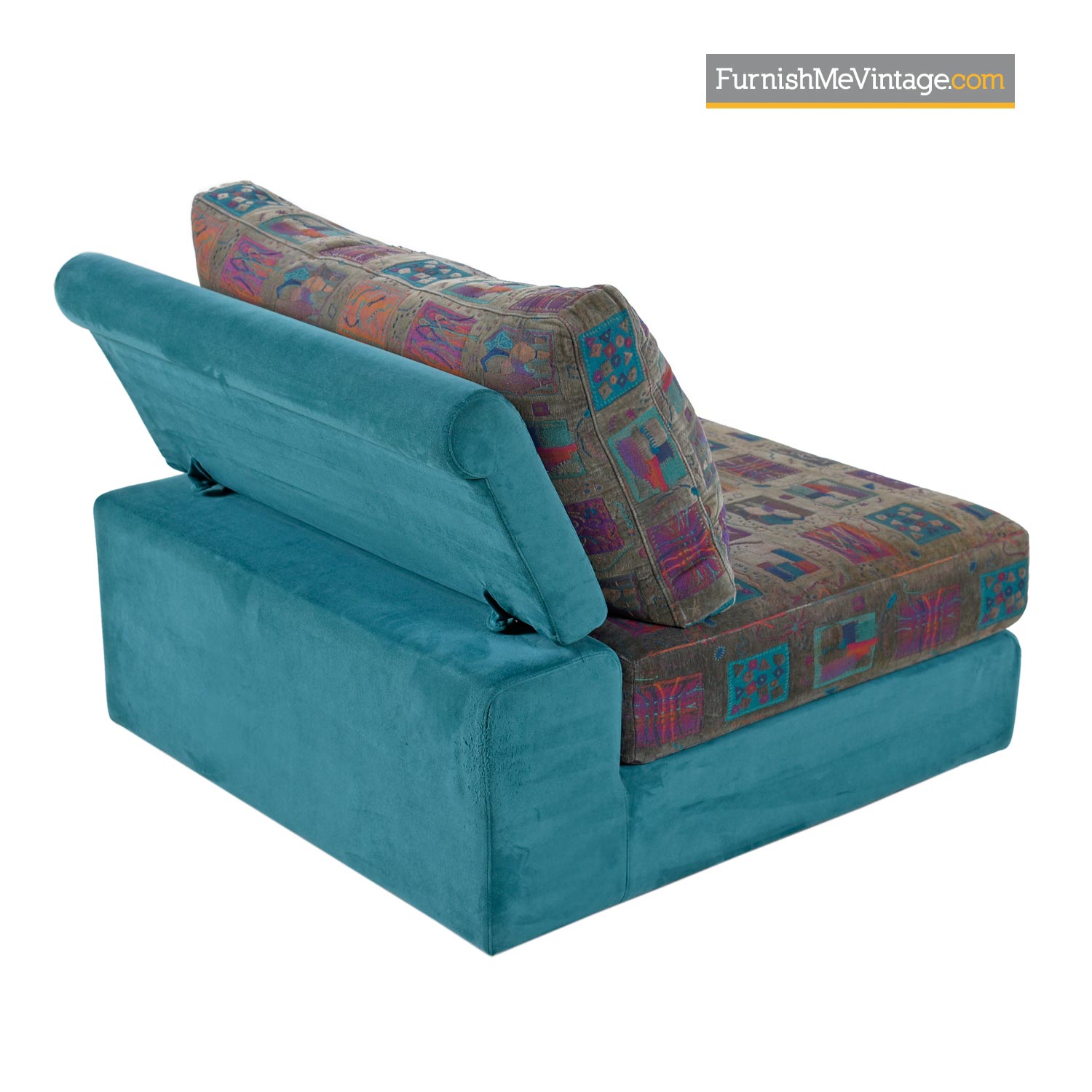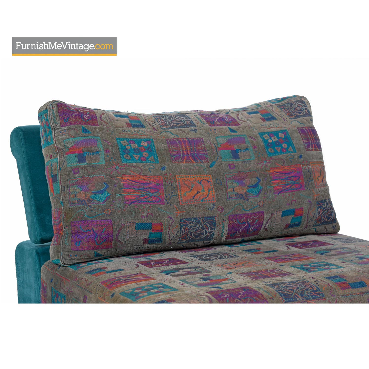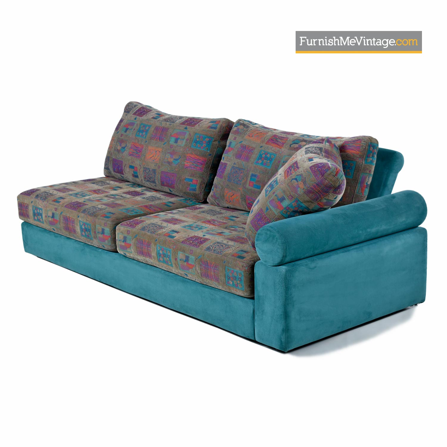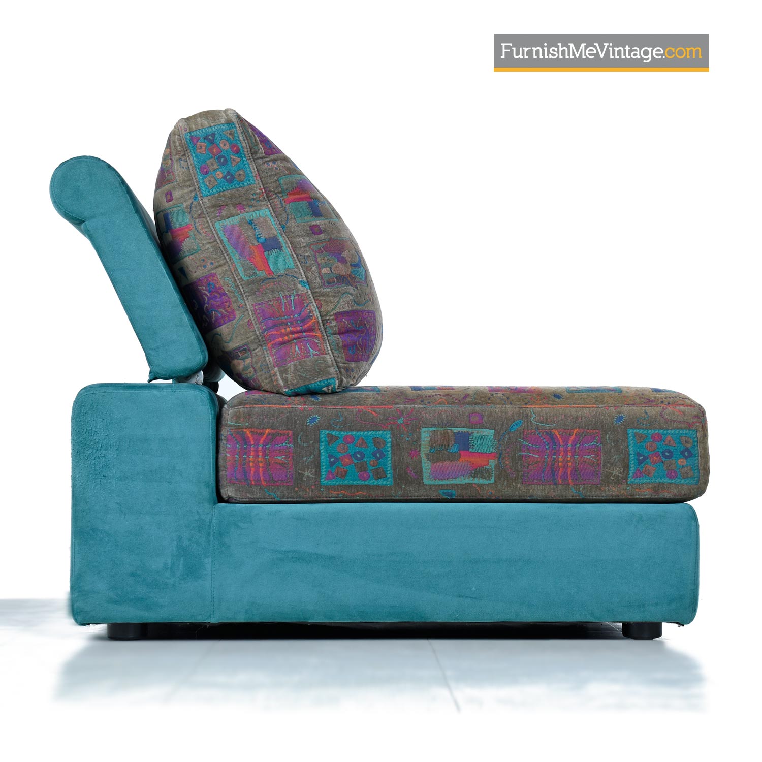 Outstanding quality is the distinction with this charming modern DellaRobbia sectional sofa seating group. A true luxury brand. The sectional consists of four modules; (2) lounge chairs, (1) corner piece, and (1) love seat with right facing arm. Each piece can be used independently or joined to create various configurations of a sectional. Both of the love seat sections feature adjustable back/head rests allowing one to position the back support in a standard upright position, or two different reclined angles. The sofa boasts it’s original teal microsuede upholstery on the body with the original funky pattern on the cushions. The corner piece has been recovered in a contemporary violet fabric to compliment the original design. This sectional is of utmost craftsmanship with the goose down filling and top notch construction that made DellaRobbia famous.