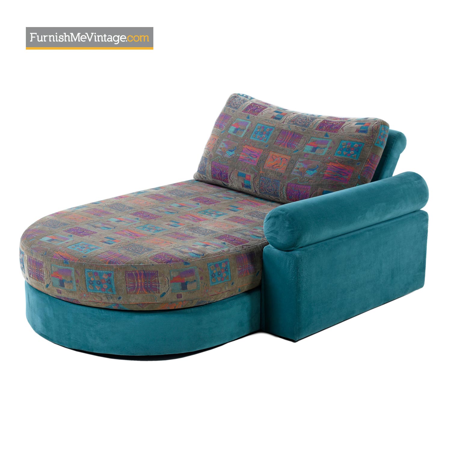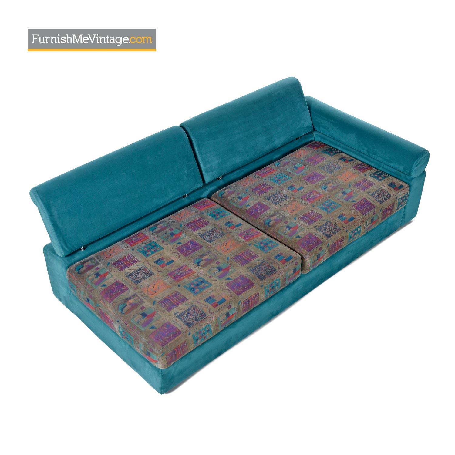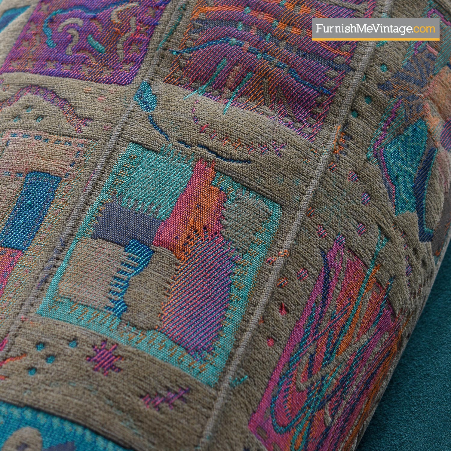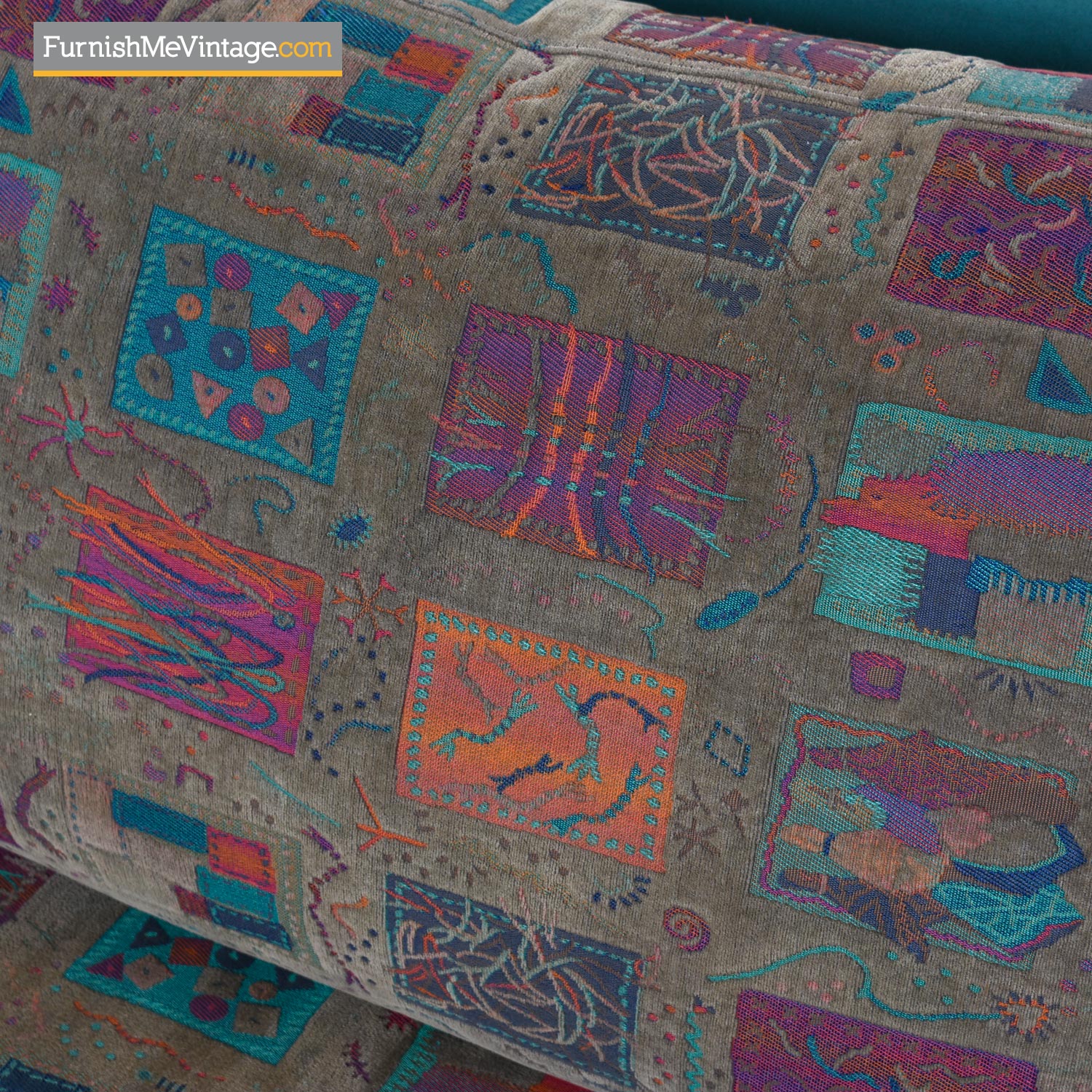 Outstanding quality is the distinction with this charming modern DellaRobbia sectional sofa seating group. A true luxury brand. The sectional consists of four modules; (2) lounge chairs, (1) corner piece, and (1) love seat with right facing arm. Each piece can be used independently or joined to create various configurations of a sectional. Both of the love seat sections feature adjustable back/head rests allowing one to position the back support in a standard upright position, or two different reclined angles. The sofa boasts it’s original teal microsuede upholstery on the body with the original funky pattern on the cushions. The corner piece has been recovered in a contemporary violet fabric to compliment the original design. This sectional is of utmost craftsmanship with the goose down filling and top notch construction that made DellaRobbia famous.